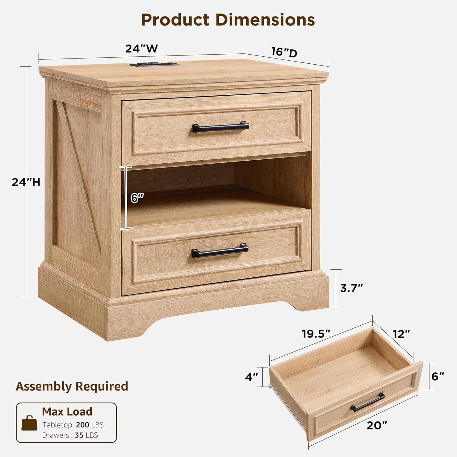 ACCOHOHO 24" Farmhouse Nightstand Set of 2 with Charging Station, 2 Drawers Large Bedside Table with Open Shelf, Rustic End Table for Bedroom - Natural Oak